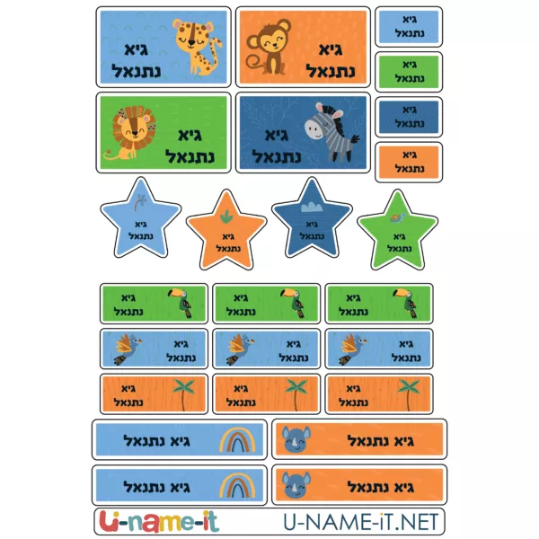 מדבקות שם מעוצבות בהתאמה אישית,למינציה- עמידות גבוהה במיקרו ומדיח- ג’ונגל