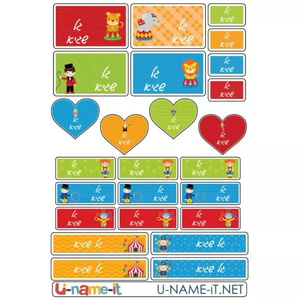 מדבקות שם מעוצבות בהתאמה אישית,למינציה- עמידות גבוהה במיקרו ומדיח – קרקס