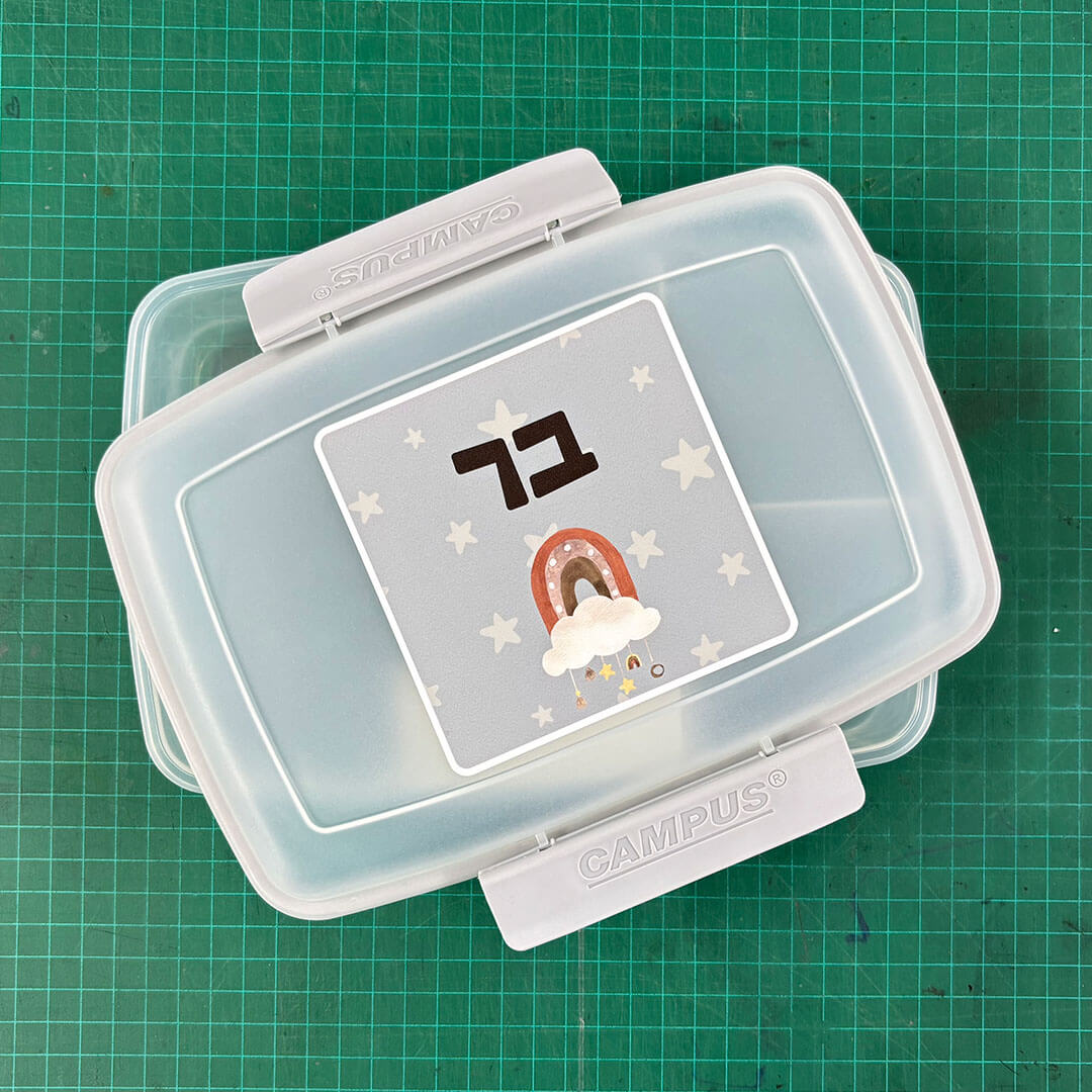 קופסת אוכל קמפוס שקוף עם מדבקת שם הילד/ה – קשת בוהו
